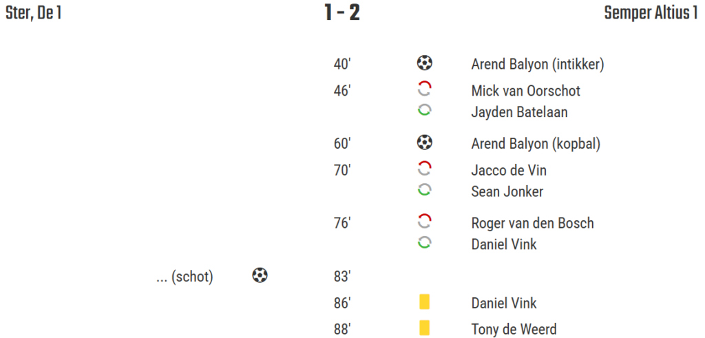 In de tweede helft veranderde er niet veel aan het spelbeeld. Wel kregen we een paar mooie kansen, maar die werden helaas niet benut. Wel maakte Arend Balijon met een mooie kopbal in de 60e minuut de 0-2. Daarna werd De Ster wat sterker en kregen ook zij wat kansen. In de 83e minuut viel uiteindelijk de 1-2. Daarna speelde Semper de wedstrijd geroutineerd uit.