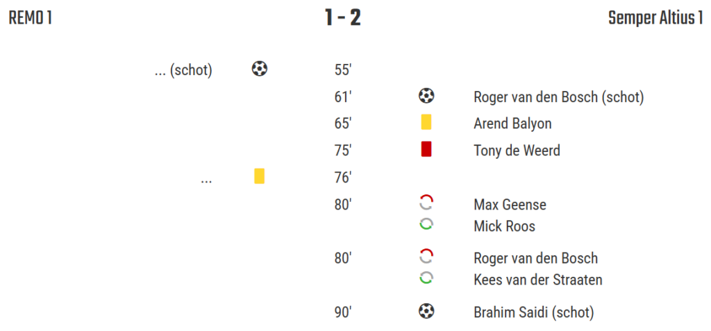 Door de veelvuldig vlaggende grensrechter van REMO bleef de stand echter gelijk, Een aantal toeschouwers bleef commentaar leveren op de grensrechter. De scheidsrechter voelde zich hier genoodzaakt om de wedstrijd vlak voor het einde enkele minuten stil te leggen. De toeschouwers werden verbannen naar de middenlijn en de laatste minuten konden worden uitgespeeld. Gelukkig voor ons scoorden Brahim Saidi ver in de extra tijd met een mooi schot van buiten het strafschopgebied toch nog de winnende treffer.