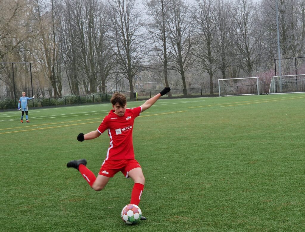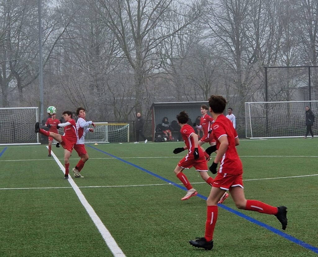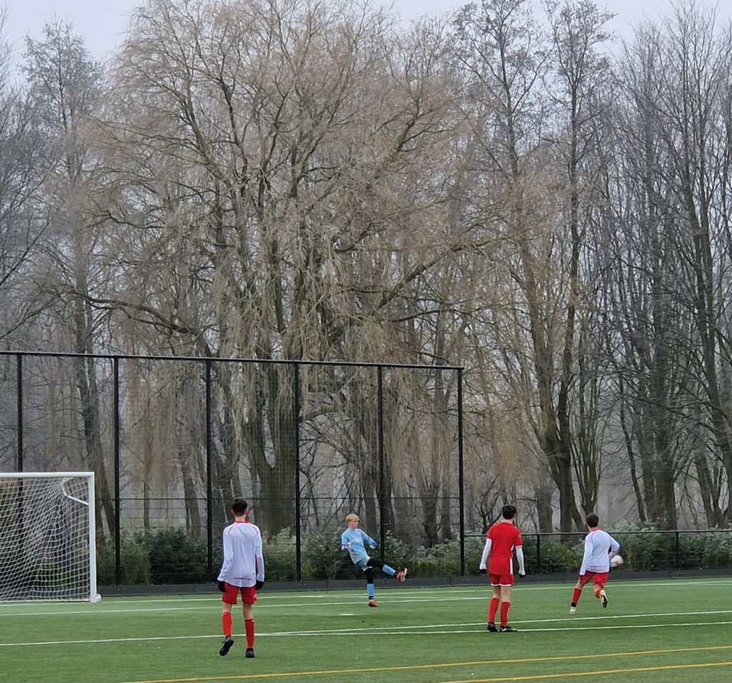In de rust vroeg ik de jongens hoe het ging. Aan de bal zijn we goed, we zijn beter dan de tegenstander en we hebben de controle waren de antwoorden. Toen ik zei dat ik het eigenlijk helemaal niet zo goed vond, volgde er wat gegniffel. Ze zullen mij inmiddels wel kennen, denk ik. Samen kwamen we tot een goede bespreking over wat er beter moest, waar op het veld dat moest en wat daarvan het resultaat zou zijn. Vol goede voornemens (Blue Monday heeft geen vat op ons) stapten we de vrieskou weer in voor de tweede helft. Het bleek dat tussen zeggen en doen er toch nog wel een wereld van verschil zat. Het eerste kwartier van de tweede helft was dan ook erg matig. Semper Altius leek weer te zoeken naar het tempo. Het tempo dat Barendrecht binnen een mum van tijd gevonden had. Ze kregen de ene kans na de andere. Het leek dus een kwestie van tijd voordat zij de score zouden openen. Stijn moest een aantal keer handelend optreden en deed dat met verve. Langzaam maar zeker trok Semper Altius in de loop van de tweede helft het initiatief weer naar zich toe. Na ongeveer 20 minuten in de tweede helft braken we dan eindelijk de ban. Rossel – die zich voor het eerst dit seizoen in de as op het middenveld vond – ontving de bal vanaf de flank. Intussen was Finnley op snelheid gekomen en werd perfect op maat bediend door Rossel. Hij maakte zich vrij, zag de keeper komen en knalde de bal langs de keeper: 1-0. Dit leek de spirit bij Barendrecht behoorlijk te breken. Uiteraard zorgde dat bij ons juist voor de olie op het spreekwoordelijke vuur. De ene na de andere aanval rolde op het doel van Barendrecht af. In de tussentijd gebeurde er aan de kant iets dat altijd magisch is. Jayden en Chevano van onze JO15-2 – die voor deze wedstrijd bij ons aansloten – mochten warm gaan lopen. Als coach doet het je goed als je ziet dat ogen groot worden, adrenaline als doping door de aderen begint te gieren en er een grote glimlach op het gezicht door breekt. Na de warming up volgden de laatste instructies en losten zij de moegestreden spelers van de JO15-1 af. In de tussentijd denderde de machine door. Mede aan de hand van de energie die onze debutanten gaven, had Semper niet alleen de controle maar domineerden we nu wél. Zo’n 6 minuten vóór het einde van de wedstrijd werd Jayden bereikt rond de zestien. Gretig zocht hij zijn tegenstander op, kwam erlangs en vuurde. De bal caramboleerde tussen verdedigers, Jayden en de uitgekomen keeper. Al vallend wist hij alsnog zijn voet tegen de bal te krijgen en zo bekroonde hij zijn uitstekende debuut met een goal: 2-0! Gek genoeg leek deze goal Barendrecht dan positief te raken. Gedreven gingen zij op zoek naar de aansluitingstreffer, maar onze verdediging van Julian, Thomas, Dani en Jordi bleek uiterst solide. Schitterend om te zien hoe er tot de laatste minuut nog gestreden, gevochten en gegleden werd alsof het de eerste minuut was. Het eindsignaal was méér dan drie korte fluitjes. Het was de tweede winstpartij op rij, het was de vervolmaking van een zeer goede voorbereiding en het is hopelijk de basis voor iets heel moois.