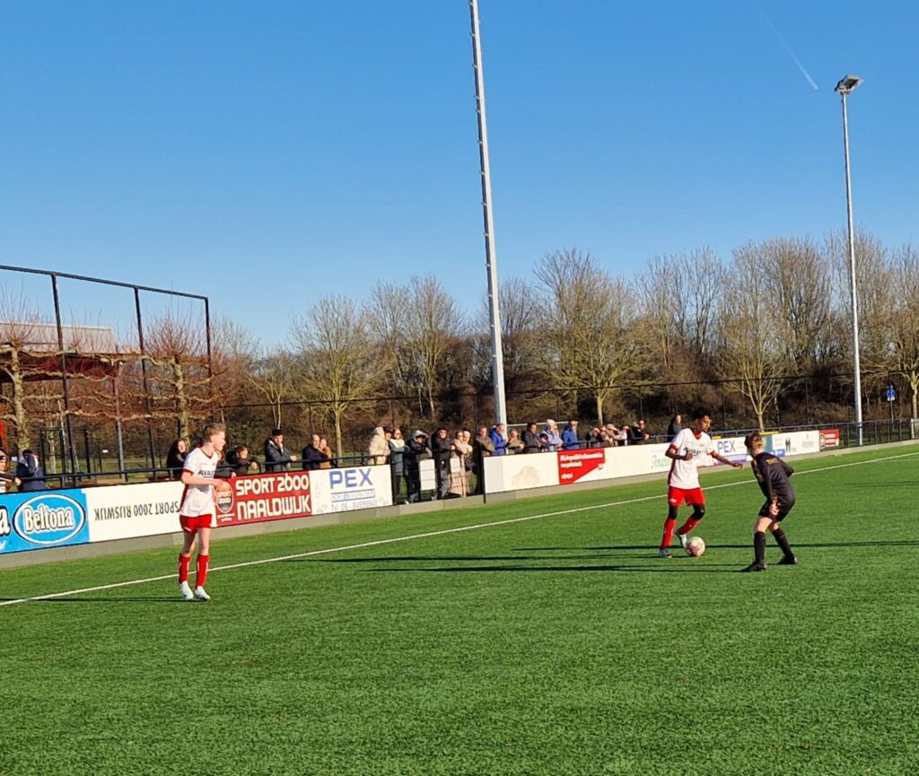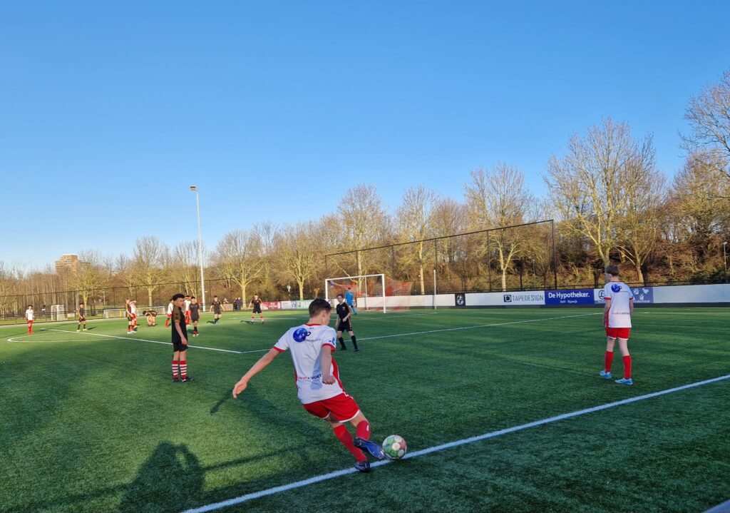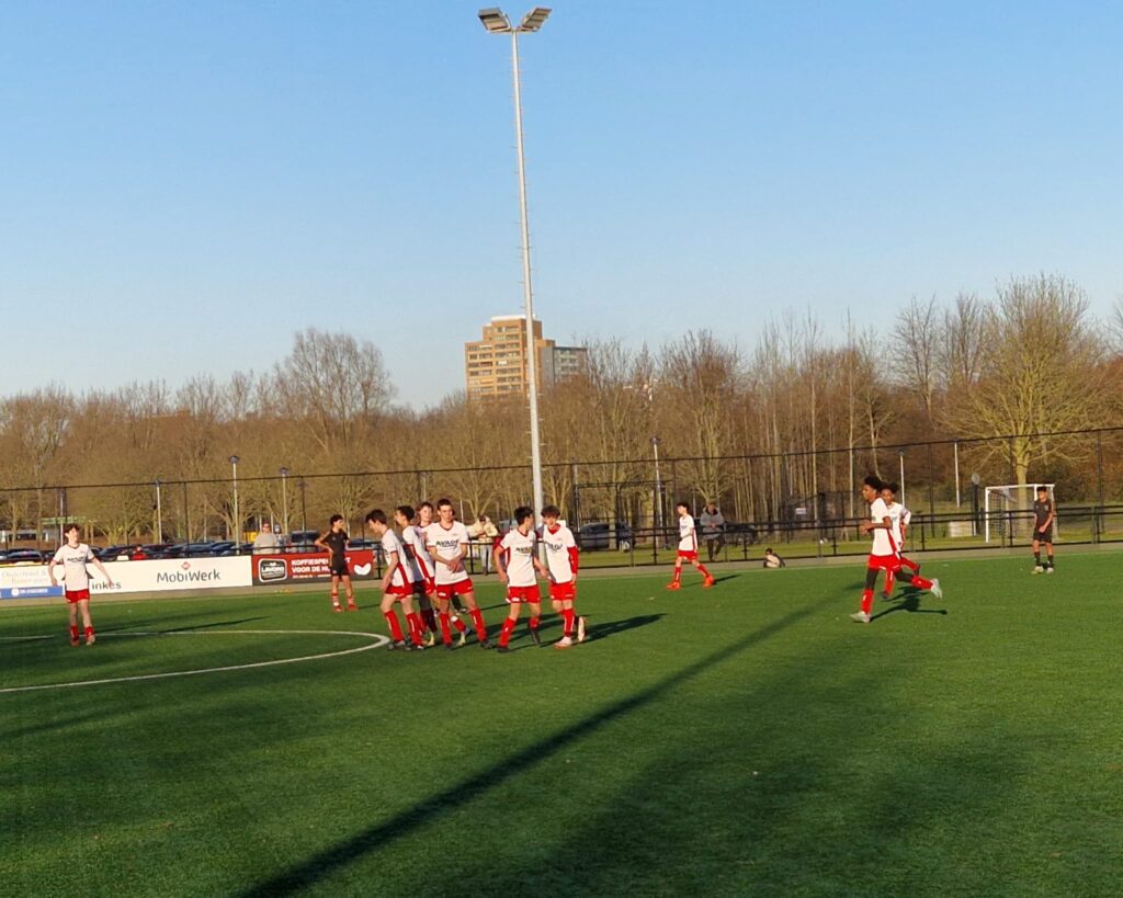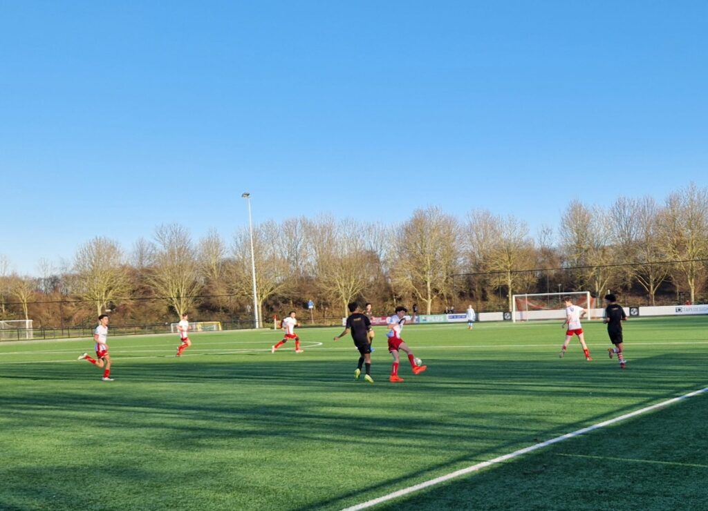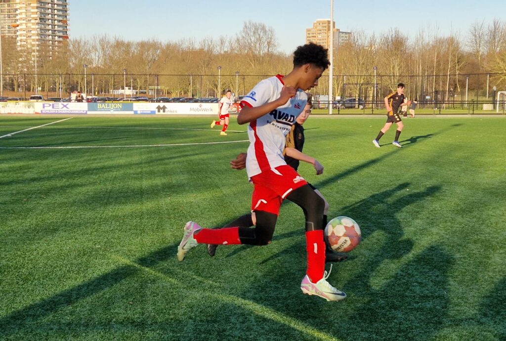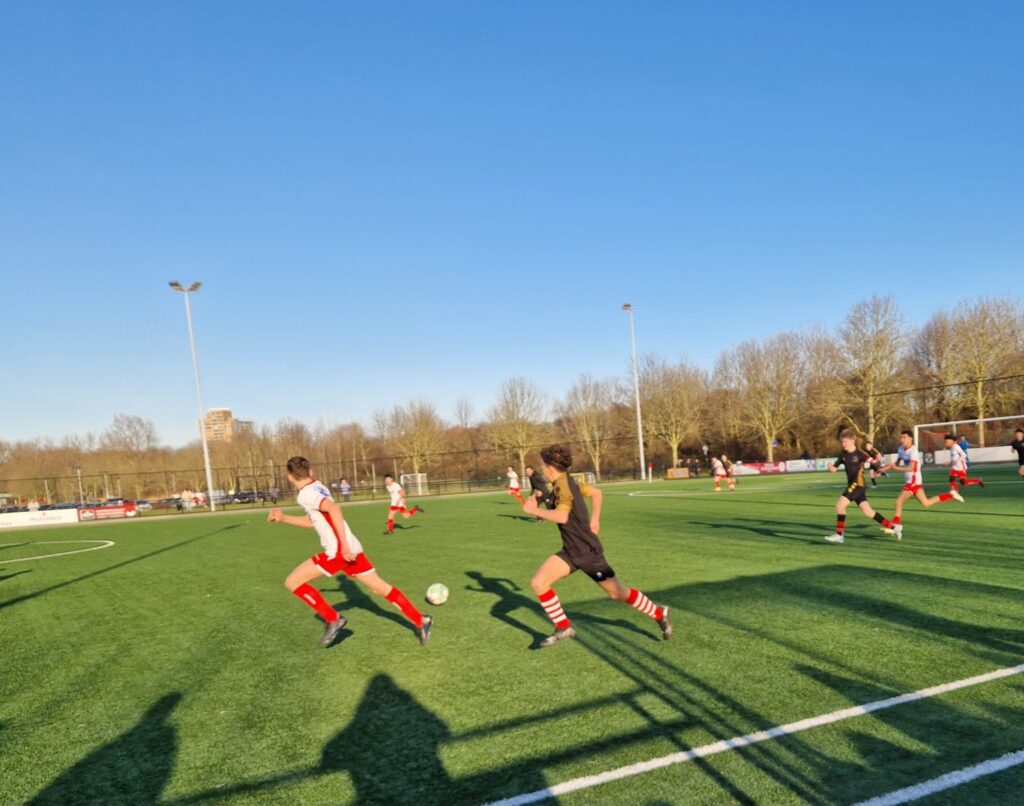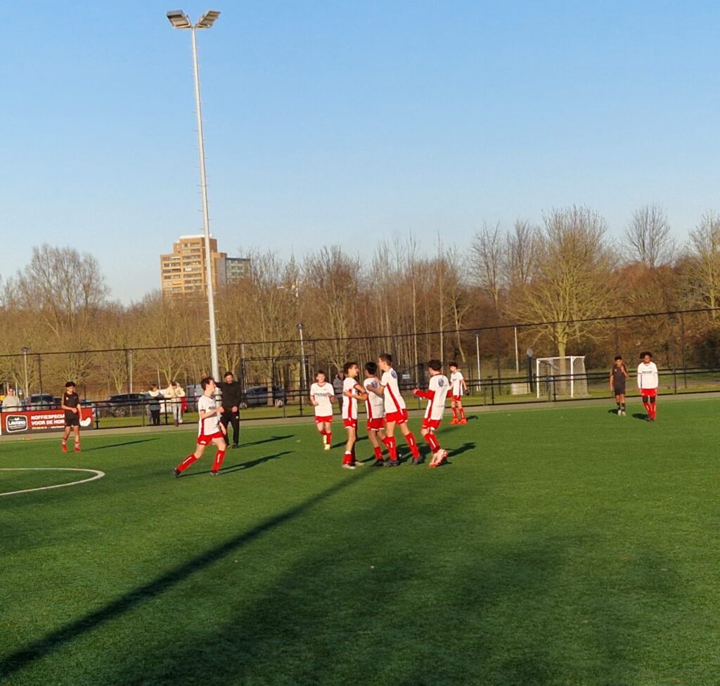 In de rust wisselden magneetjes op een bord weer snel van positie, werden vragen gesteld en werden problemen op het magneetbord opgelost. Nu moesten we die problemen alleen nog even tussen de lijnen oplossen. Dat duurde niet lang. Nick pikte zo’n 5 minuten na rust de bal op het middenveld op. Hij zag dat Jayden de diepte zocht en bediende hem perfect op maat. Terwijl de verdediger op Jayden afvloog en een clash dreigde, zette Jayden al voor op Finnley die in één keer afrondde: 1-1! Je voelde aan alles dat dit hetgeen was dat de ploeg nodig had. Met de invallers Sam en Yusuf die nieuwe energie brachten, trokken we ten strijde. RKAVV kwam er niet echt meer aan te pas. Zo nu en dan kwamen ze wel over de middenlijn, maar aanvallen werden al snel in de kiem gesmoord door onze verdediging bestaande uit Marwand, Thomas, Dani, Jordi en Rayan. Toen de tweede helft ongeveer een kwartier oud was, kreeg Yusuf het op zijn heupen. Vanaf een meter of 20 pikte hij de bal na een afgeslagen aanval op en vuurde. Met een schitterende boogbal verschalkte hij de keeper: 2-1. Op dat moment zie je dat vurige verlangen naar winst. De vreugde die zo’n goal teweeg brengt is geweldig om te zien. Maar wat je daarna ziet is nog veel mooier: jongens die elkaar oppeppen, wijzen op gemaakte afspraken en de organisatie met zijn allen neerzetten. Met nog een minuut of 12 te spelen, gooiden we het duel definitief in het slot. Rossel won zijn duel op het middenveld (wat hij overigens het merendeel van de wedstrijd deed) en had een schitterende assist in huis op Finnley, die al op snelheid was. Finnley had wat moeite om te controleren, maar herstelde zich. Nadat hij de bal klaar had gelegd, schoot hij met overtuiging binnen: 3-1. Na het gejuich zag je weer de collectieve aandacht bij de taken, jongens die hun medespelers de moed toeschreeuwden voor de resterende 12 minuten. Met een discipline die bewonderenswaardig is, speelden we de wedstrijd uit. Op een zeker moment leek het zelfs nog even op gallery play. Als Sam de bal controleert, ziet hij een tegenstander op zich af snellen. Met een snelle voetbeweging deelt hij een heerlijke panna uit, waarna hij de bal vrij heeft en voor kan zetten. Helaas komen we net tekort om deze heerlijke actie tot doelpunt te promoveren.