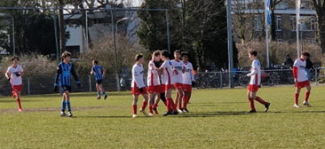 De analisten onder ons maken zich al op voor een logische ruststand (0-0), maar daar denkt Dani anders over. Hij gaat achter een terecht gegeven vrije trap staan, zo’n 20 meter van de goal. De keeper is druk doende om zijn muur goed te zetten en posteert zich in de korte hoek. Dat heeft Dani gezien. Hij neemt een aanloop en krult de bal werkelijk fenomenaal de linkerkruising in: 0-1! Gezien het wedstrijdbeeld misschien geen terechte tussenstand, maar daar geeft niemand met een roodwit hart om. Met een kleine glimlach zoeken we de kleedkamer op voor de rust.