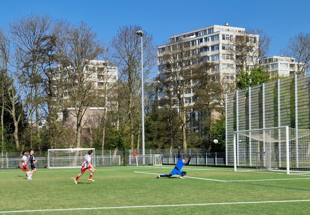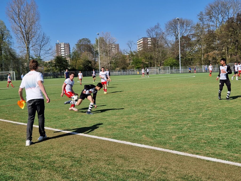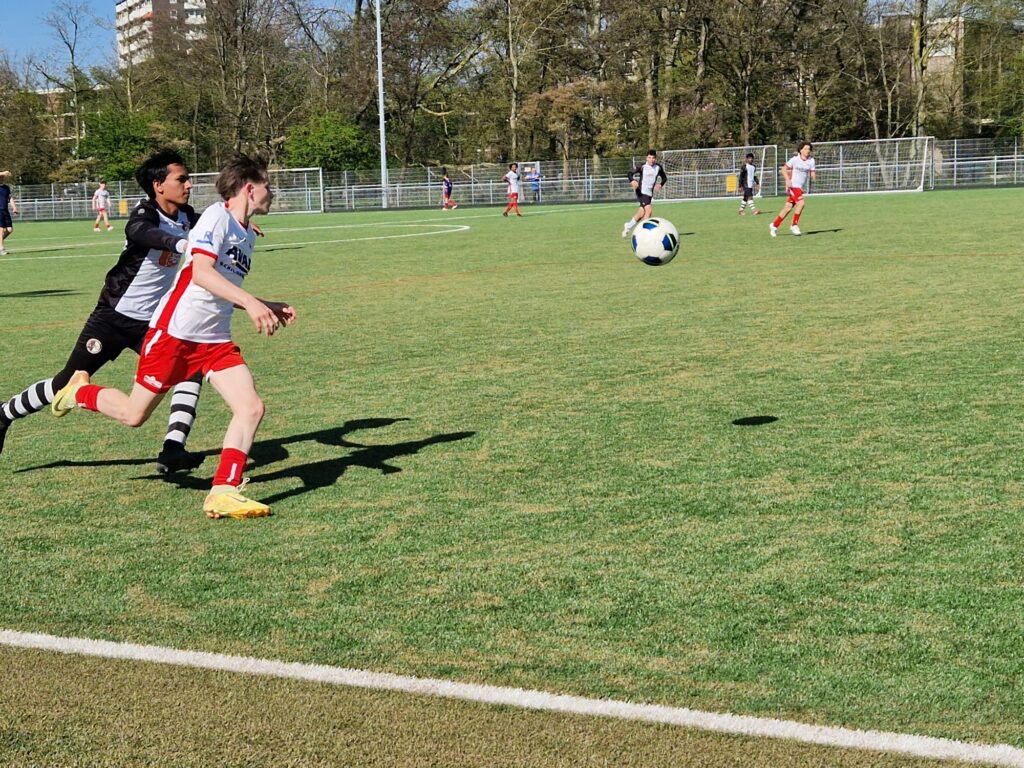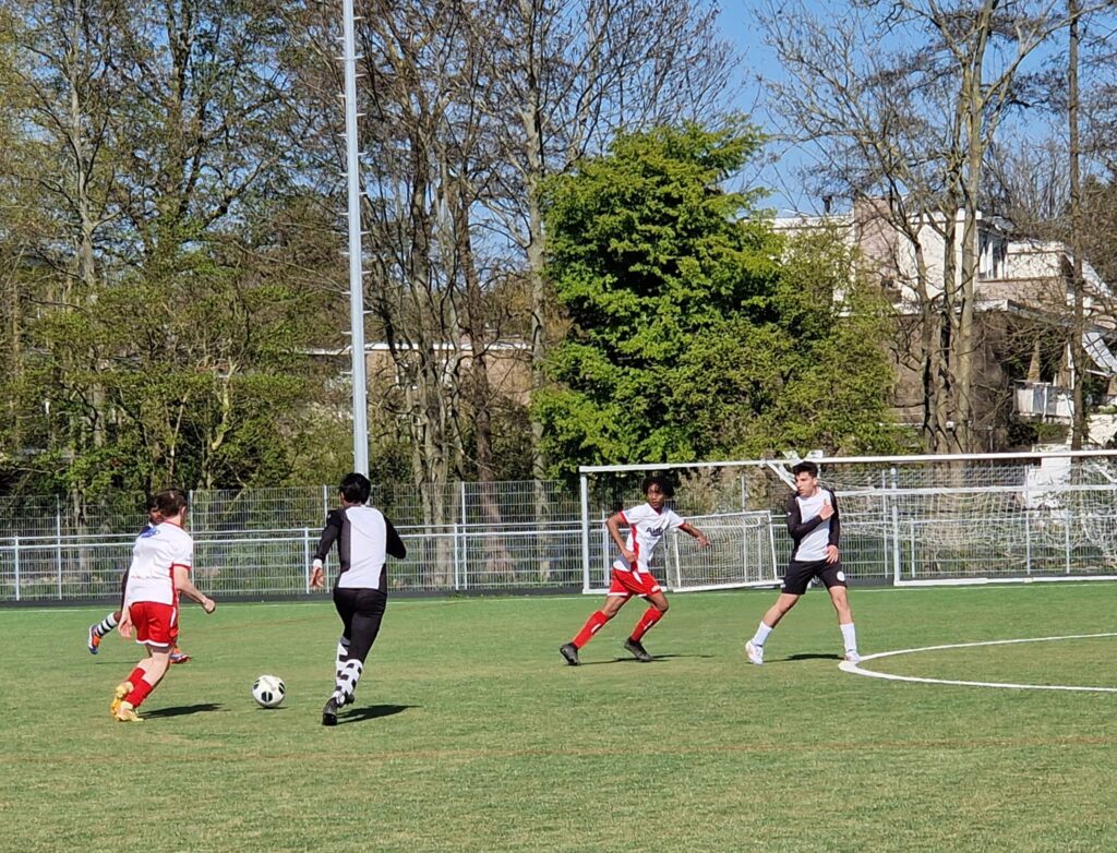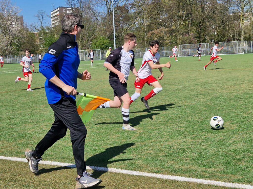 Binnen een minuut doen we al zaken. Yusuf Gülsoy ontfutselt de tegenstander de bal en ziet een lege linkerflank voor zich. Hij zet aan en blijkt veel sneller te zijn dan zijn directe tegenstander. Met een bekeken schuiver bekroont hij zijn uitstekende wedstrijd met een goal: 0-3. Hiermee lijkt het verzet van de tegenstander wel gebroken te zijn. Wat ook schade lijkt te hebben opgelopen, is de hamstring van de dienstdoende scheidsrechter. Het gebeurt ons wel eens dat we een tegenstander kapot spelen. Maar een scheidsrechter kapot spelen is ons nog nooit gelukt. De beste man moest de strijd helaas definitief staken. Uiteraard wensen wij hem heel veel beterschap toe. Gelukkig voor ons hadden wij Jacco nog achter de hand. Hij was bereid om de vlag te verruilen voor de fluit en de wedstrijd te gaan leiden. Gelukkig voor ons was Jayden (zoon van ondergetekende en tevens assistent-coach van Semper Altius JO13-1) bereid om de vlag te hanteren en konden we door. Zo rond de 50e minuut laat Rayan dan even zijn klasse zien. Hij pikt de bal op en ziet Finnley vertrekken. Met een werkelijk puntgave pass zet hij Finnley één op één met de keeper. Finnley zet met een droge knal zijn handtekening onder zijn 18e goal van het seizoen: 0-4. Maar de mooiste goal van de middag komt op naam van Rossel. Zo’n 5 minuten voor het einde krijgt hij de bal in bezit. Even kijkt hij op en dan krult hij de bal fantastisch binnenkantje paal binnen. Voor hem ook alweer zijn 12e goal van het seizoen. Zo tekent zich op het hete kunstgras bij VUC toch wel een flinke overwinning af voor onze mannen. Er komt nog wel een heel klein smetje. Want met een aantal goede reddingen - zeker in de laatste fase als de krachten bij ons wel wat weggevloeid zijn - onderscheidt Stijn zich met een aantal uitstekende reddingen. Toch krijgt hij zijn wel verdiende clean sheet niet. Bij een corner vergeten we even de druk op de man met de bal te zetten waarna de spits van VUC zijn middag toch met een doelpuntje weet op te leuken.